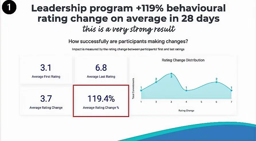 Here, you can see how a group of leaders started out rating themselves 3 out of 10 on a specific leadership behaviour, and 29 days later, their ratings were up to 7 out of 10. That amounts to +119% behavioural change across the group.